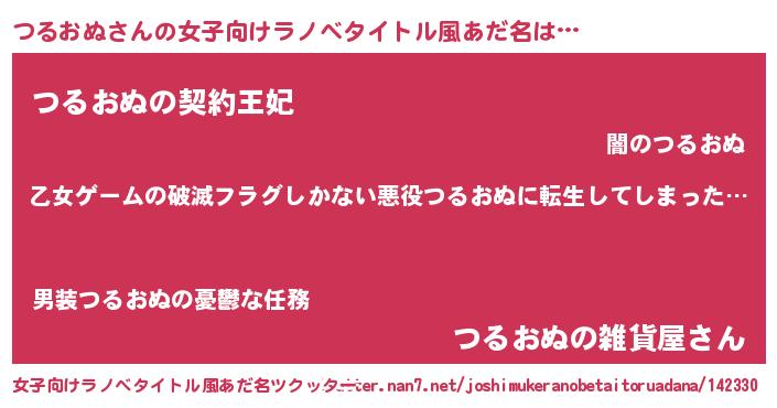 つるおぬさんの女子向けラノベタイトル風あだ名は… 『乙女ゲームの破滅フラグしかない悪役つるおぬに転生してしまった…』『つるおぬの契約王妃』『つるおぬの雑貨屋さん』 ツクッター #女子向けラノベタイトル風あだ名ツクッター http://tkutter.nan7.net/joshimukeranobetaitoruadana/142330/