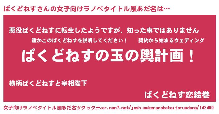 | 男性向けラノベタイトル風あだ名 | 『ばくどねす~年齢イコール彼女いない歴の魔法使い~』 |