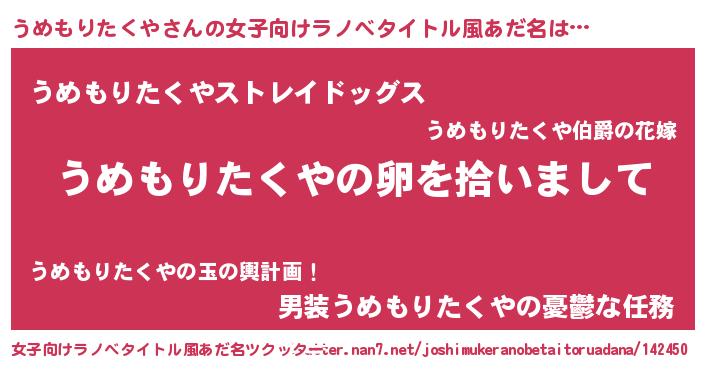 | 男性向けラノベタイトル風あだ名 | 『うめもりたくやの嫁は女の子じゃないと思った?』 |