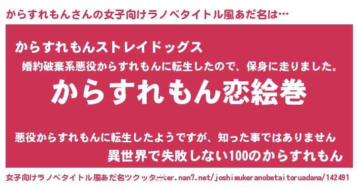 | 男性向けラノベタイトル風あだ名 | 『おまえをオタクにしてやるから、俺をからすれもんにしてくれ! 』 |