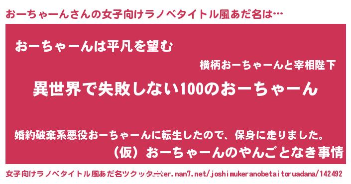 | 男性向けラノベタイトル風あだ名 | 『おーちゃーんという概念が存在しない退屈な世界 』 |