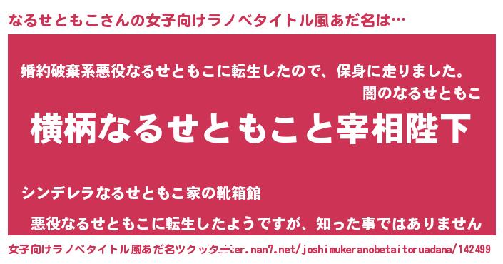| 男性向けラノベタイトル風あだ名 | 『なるせともこに滅ぼされるだけの簡単なお仕事です』 |