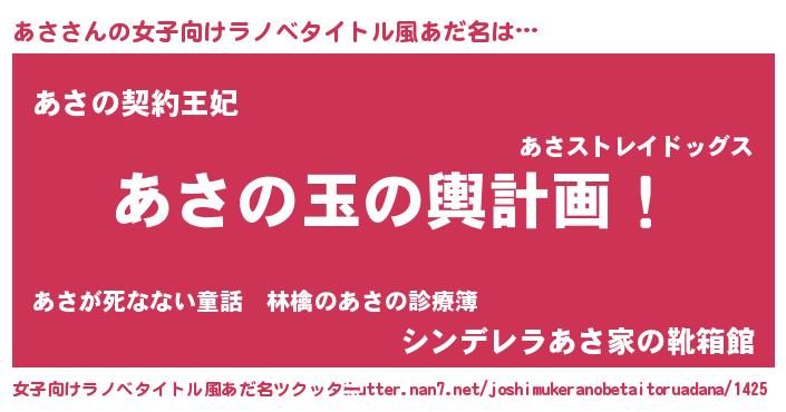 | 男性向けラノベタイトル風あだ名 | 『あさ~年齢イコール彼女いない歴の魔法使い~』 |