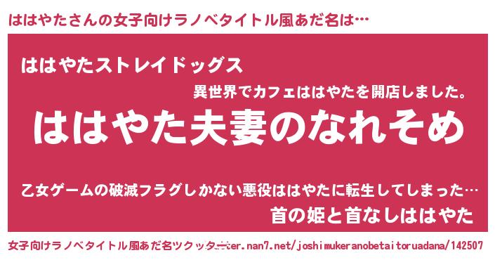 | 男性向けラノベタイトル風あだ名 | 『おまえをオタクにしてやるから、俺をははやたにしてくれ! 』 |