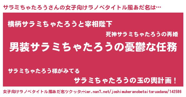 | 男性向けラノベタイトル風あだ名 | 『うちのサラミちゃたろうが世界を掌握している!』 |