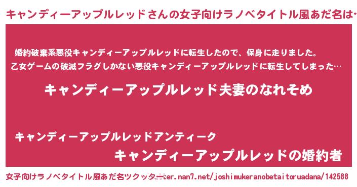 | 男性向けラノベタイトル風あだ名 | 『おまえをオタクにしてやるから、俺をキャンディーアップルレッドにしてくれ! 』 |