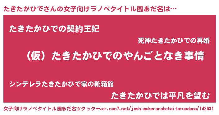 | 男性向けラノベタイトル風あだ名 | 『たきたかひでの憂鬱』 |
