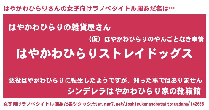 | 男性向けラノベタイトル風あだ名 | 『Re:はやかわひらりから始める異世界生活』 |