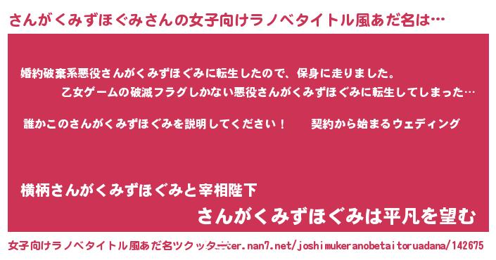 さんがくみずほぐみさんの女子向けラノベタイトル風あだ名は… 『誰かこのさんがくみずほぐみを説明してください! ~契約から始まるウェディング~』『婚約破棄系悪役さんがくみずほぐみに転生したので、保身に走りました。』『さんがくみずほぐみは平凡を望む』 ツクッター #女子向けラノベタイトル風あだ名ツクッター http://tkutter.nan7.net/joshimukeranobetaitoruadana/142675/