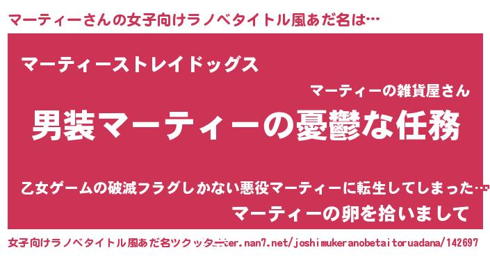 | 男性向けラノベタイトル風あだ名 | 『うちのマーティーが世界を掌握している!』 |
