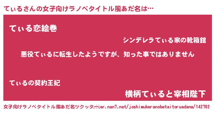| 男性向けラノベタイトル風あだ名 | 『この素晴らしい世界にてぃるを!』 |