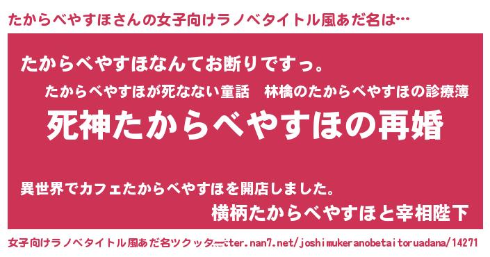 | 男性向けラノベタイトル風あだ名 | 『ノーゲーム・ノータカラベヤスホ』 |