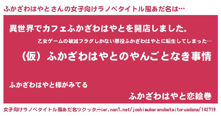 | 男性向けラノベタイトル風あだ名 | 『ふかざわはやとの憂鬱』 |