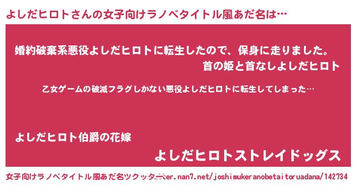 | 男性向けラノベタイトル風あだ名 | 『魔弾の王とよしだヒロト』 |
