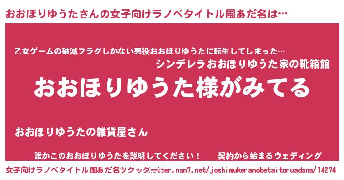 | 男性向けラノベタイトル風あだ名 | 『おおほりゆうたの嫁は女の子じゃないと思った?』 |