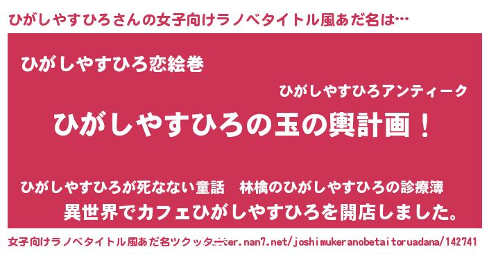 | 男性向けラノベタイトル風あだ名 | 『ひがしやすひろ~年齢イコール彼女いない歴の魔法使い~』 |