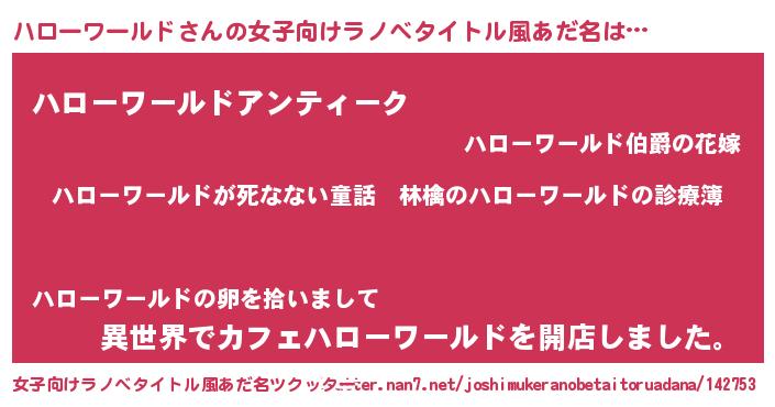 ハローワールドさんの女子向けラノベタイトル風あだ名は… 『ハローワールドが死なない童話 林檎のハローワールドの診療簿』『ハローワールドアンティーク』『異世界でカフェハローワールドを開店しました。』 ツクッター #女子向けラノベタイトル風あだ名ツクッター http://tkutter.nan7.net/joshimukeranobetaitoruadana/142753/
