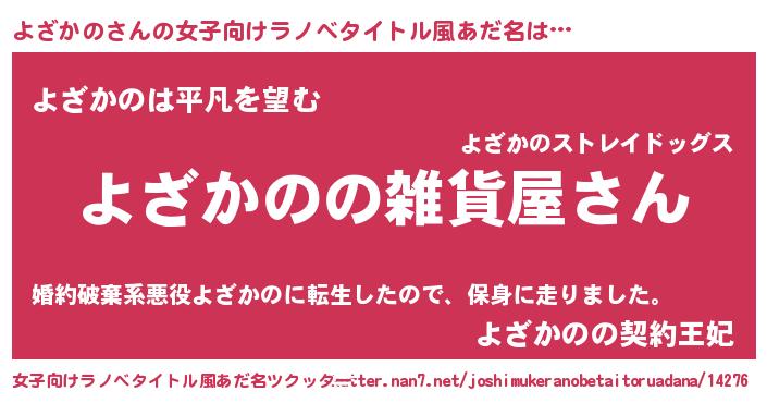 よざかのさんの女子向けラノベタイトル風あだ名は… 『よざかのの雑貨屋さん』『よざかのは平凡を望む』『よざかのの契約王妃』 ツクッター #女子向けラノベタイトル風あだ名ツクッター http://tkutter.nan7.net/joshimukeranobetaitoruadana/14276/