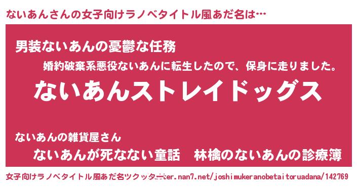 | 男性向けラノベタイトル風あだ名 | 『Re:ないあんから始める異世界生活』 |