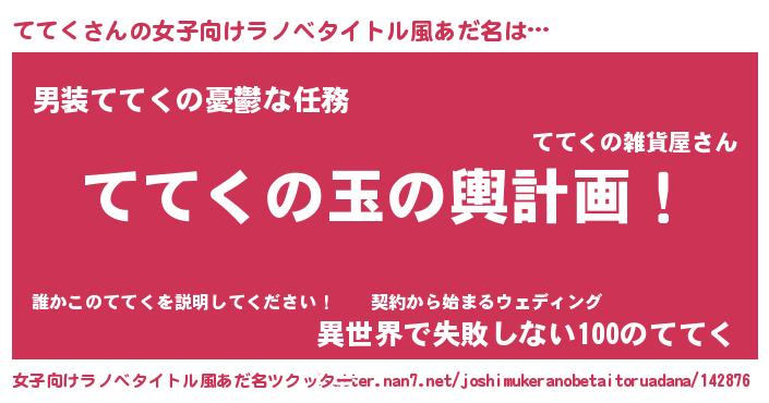 | 男性向けラノベタイトル風あだ名 | 『ててく~年齢イコール彼女いない歴の魔法使い~』 |