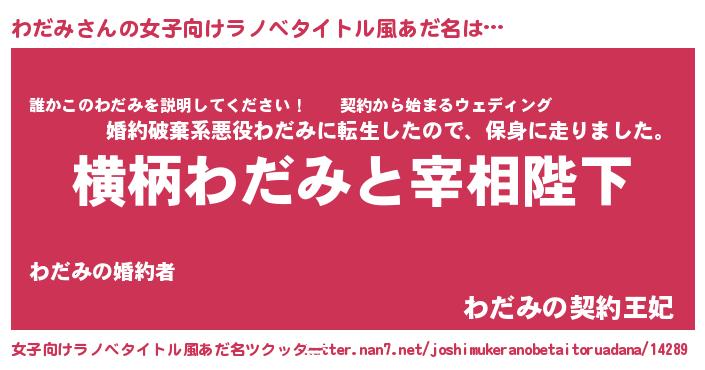 | 男性向けラノベタイトル風あだ名 | 『わだみに滅ぼされるだけの簡単なお仕事です』 |