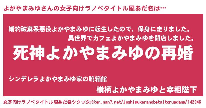 | 伝説のあだ名 | 『救世主となる錬金術士よかやまみゆ』 |