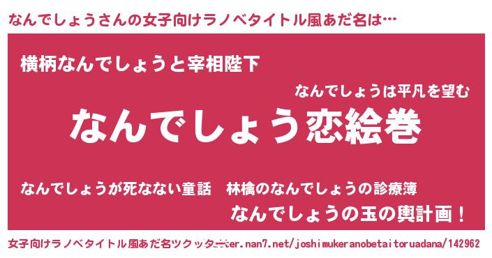 なんでしょうさんの女子向けラノベタイトル風あだ名は… 『なんでしょう恋絵巻』『横柄なんでしょうと宰相陛下』『なんでしょうの玉の輿計画!』 ツクッター #女子向けラノベタイトル風あだ名ツクッター http://tkutter.nan7.net/joshimukeranobetaitoruadana/142962/