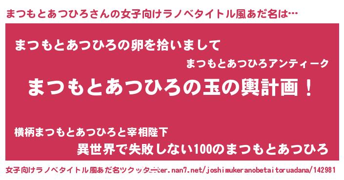 | 男性向けラノベタイトル風あだ名 | 『まつもとあつひろ~年齢イコール彼女いない歴の魔法使い~』 |