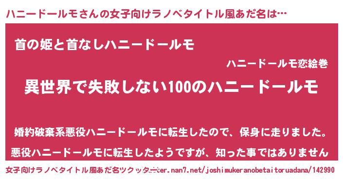 | 男性向けラノベタイトル風あだ名 | 『ハニードールモという概念が存在しない退屈な世界 』 |