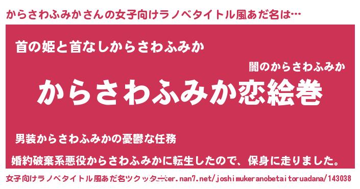 | 男性向けラノベタイトル風あだ名 | 『おまえをオタクにしてやるから、俺をからさわふみかにしてくれ! 』 |