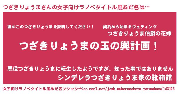 | 男性向けラノベタイトル風あだ名 | 『つざきりょうま~年齢イコール彼女いない歴の魔法使い~』 |