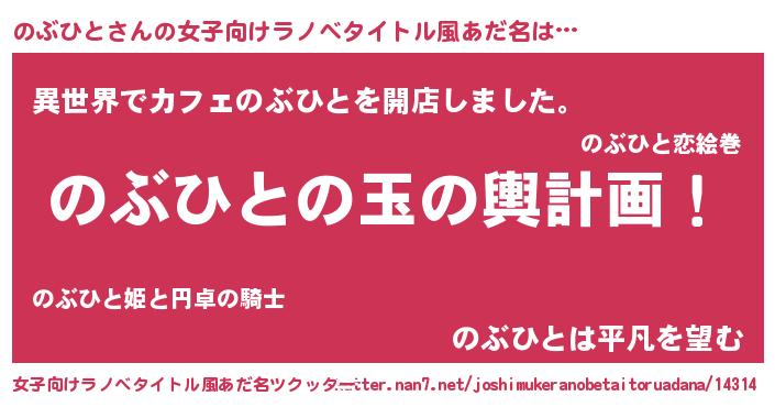 | 男性向けラノベタイトル風あだ名 | 『のぶひと~年齢イコール彼女いない歴の魔法使い~』 |