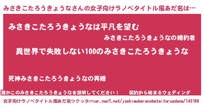 | 男性向けラノベタイトル風あだ名 | 『みさきこたろうきょうなという概念が存在しない退屈な世界 』 |