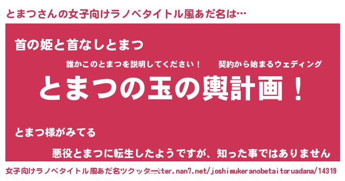 | 男性向けラノベタイトル風あだ名 | 『転生したらとまつだった件』 |