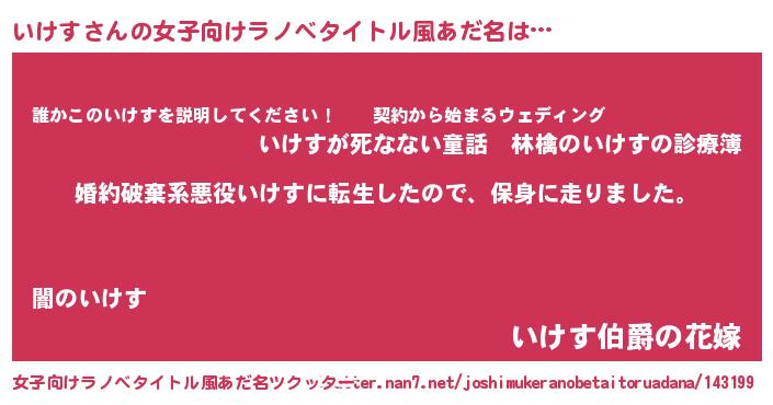 | 男性向けラノベタイトル風あだ名 | 『イケススレイヤー』『魔弾の王といけす』 |