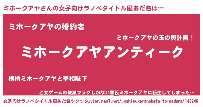 | 男性向けラノベタイトル風あだ名 | 『魔法科高校のミホークアヤ』 |