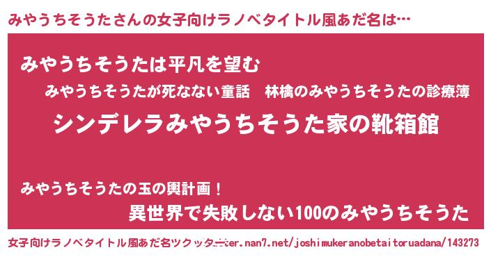 | 胡散臭い通販商品みたいなあだ名 | 『信頼と実績のサプリメント…その名も「みやうちそうた」』 |