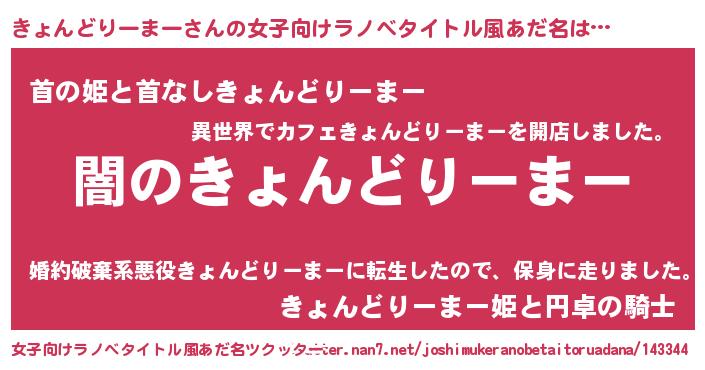 | 男性向けラノベタイトル風あだ名 | 『Re:きょんどりーまーから始める異世界生活』 |