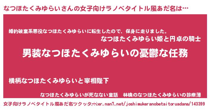 | 男性向けラノベタイトル風あだ名 | 『うちのなつほたくみゆらいが世界を掌握している!』 |