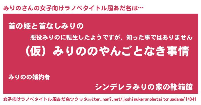 | 男性向けラノベタイトル風あだ名 | 『みりのの憂鬱』『はたらくみりのさま!』 |