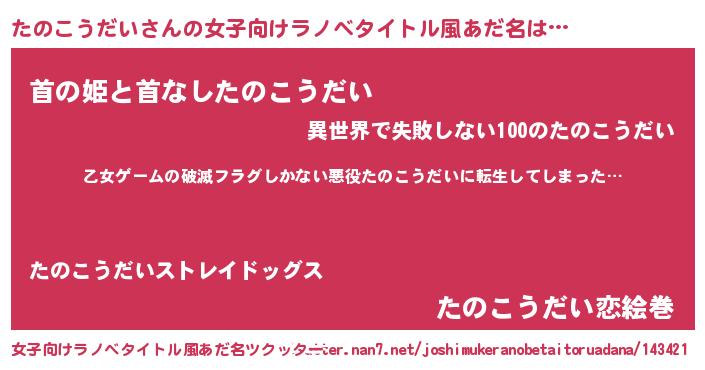 | 男性向けラノベタイトル風あだ名 | 『この素晴らしい世界にたのこうだいを!』 |