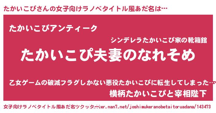 | 男性向けラノベタイトル風あだ名 | 『おまえをオタクにしてやるから、俺をたかいこぴにしてくれ! 』 |