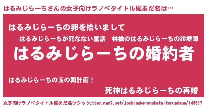 | 男性向けラノベタイトル風あだ名 | 『うちの娘の為ならば、俺はもしかしたらはるみじらーちも倒せるかもしれない。』 |