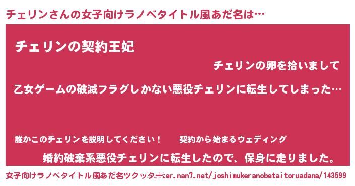 | 男性向けラノベタイトル風あだ名 | 『魔弾の王とチェリン』 |