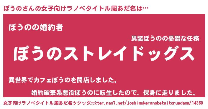 ぼうのさんの女子向けラノベタイトル風あだ名は… 『ぼうのストレイドッグス』『ぼうのの婚約者』『婚約破棄系悪役ぼうのに転生したので、保身に走りました。』 ツクッター #女子向けラノベタイトル風あだ名ツクッター http://tkutter.nan7.net/joshimukeranobetaitoruadana/14360/