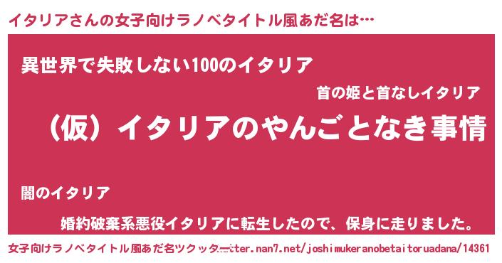 | 男性向けラノベタイトル風あだ名 | 『イタリアの憂鬱』『イタリアスレイヤー』 |