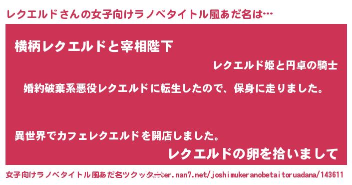 | 胡散臭い通販商品みたいなあだ名 | 『信頼と実績のサプリメント…その名も「レクエルド」』 |