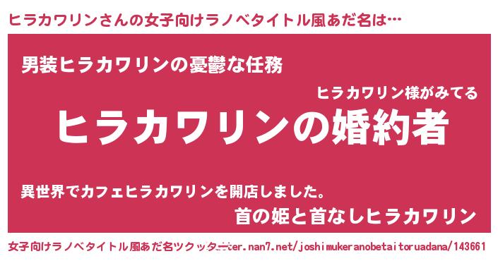 ヒラカワリンさんの女子向けラノベタイトル風あだ名は… 『ヒラカワリンの婚約者』『男装ヒラカワリンの憂鬱な任務』『首の姫と首なしヒラカワリン』 ツクッター #女子向けラノベタイトル風あだ名ツクッター http://tkutter.nan7.net/joshimukeranobetaitoruadana/143661/