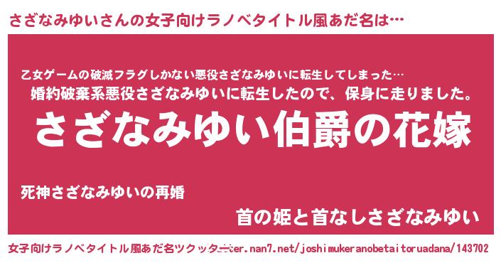 | 男性向けラノベタイトル風あだ名 | 『やはりさざなみゆいの青春ラブコメはまちがっている 』 |
