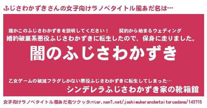 | 男性向けラノベタイトル風あだ名 | 『Re:ふじさわかずきから始める異世界生活』 |